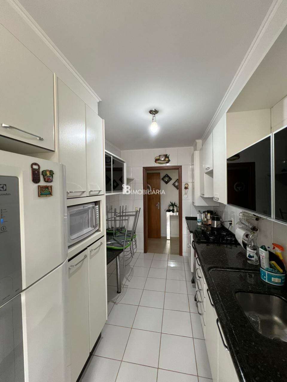 Cozinha com armários planejados, pia em pedra, geladeira e fogão inclusos
